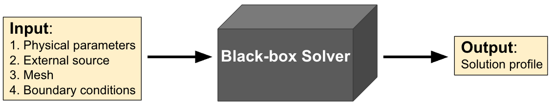 Black-box solvers are systems that are best viewed as versatile solvers that deal with systems of equations without getting into too much mathetmatical detail. They are mostly closed-source solvers that take in equations or scenarios as inputs and give out the solution as an output. For example, you may have a finite element solver that solves the steady-state heat equation depending on the physical parameters (like diffusivity) and the boundary conditions that you input, along with a mesh resolution that you also provide; see Fig. 1. for a diagram showing this process. But to ensure that the solution is accurate on whatever scenario you input, it is important do convergence studies with known manufactured solutions, or at least fine-grid solutions, and most importantly, a test of robustness of the scheme.