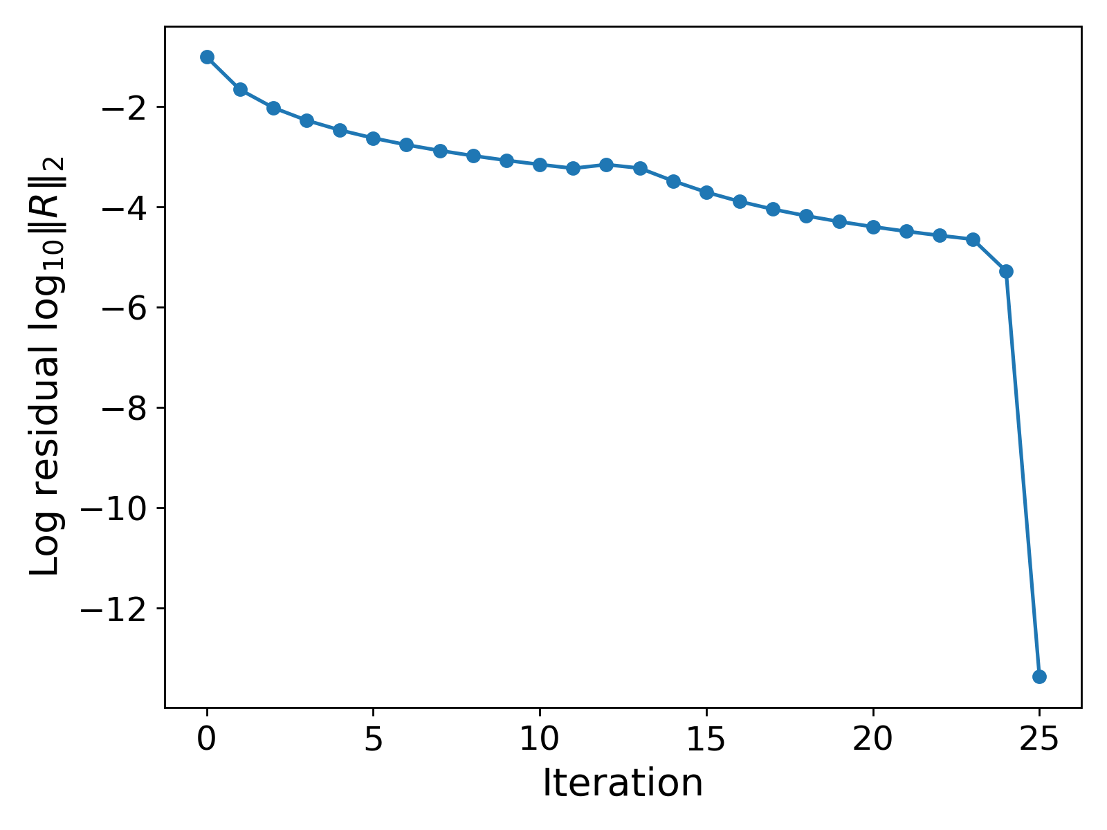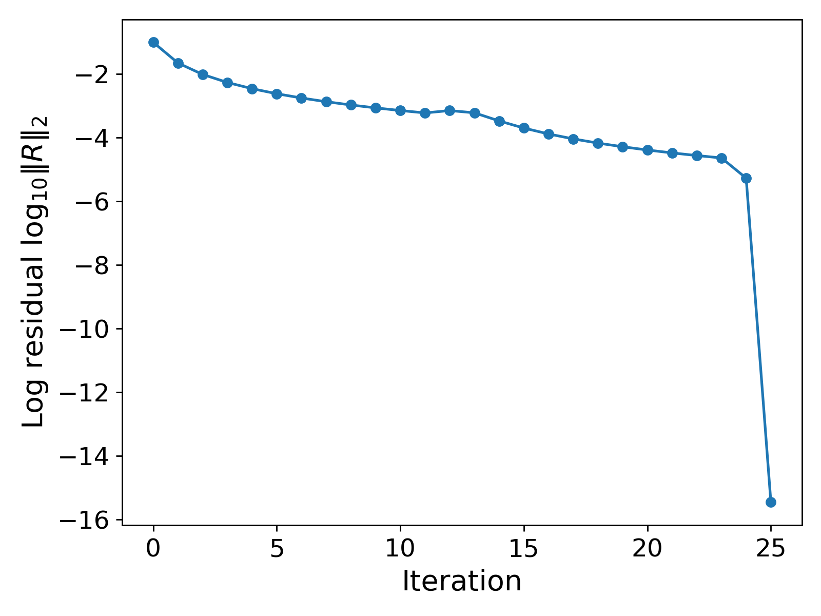 Robustness testing: changing the initial guess. The results in Fig. 2. show the convergence of the CG method, and in fact, the solver does not struggle to converge. However, to test the robustness of our solver, we provide a different initial guess. We choose ${u_h}^{(0)} = 1$. If our computational method is indeed robust, then we should still hope for convergence to the same solution profile as shown in Fig. 2. regardless of the initial guess (reasonable intial guess!). The results with this new initial guess are shown in Fig. 4.