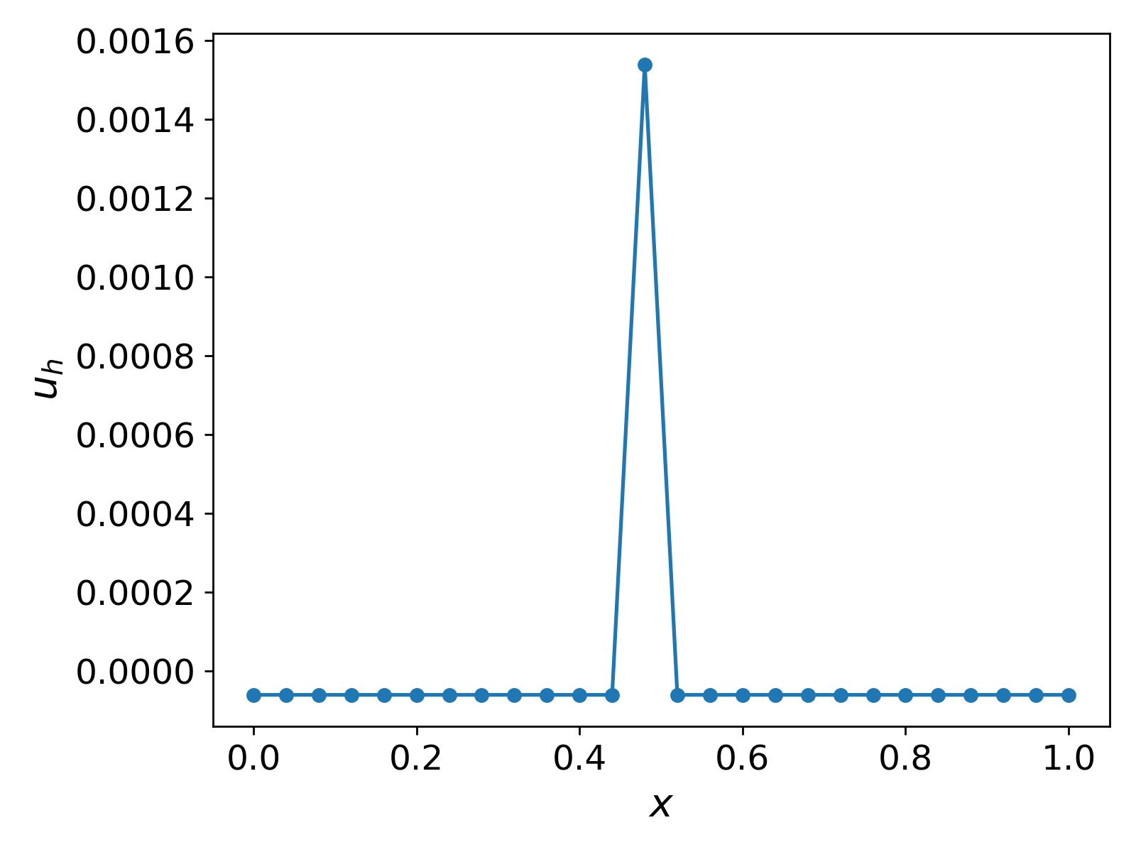 It can be observed that the solution $u_h$ is $0$ everywhere except at $x = 0.48$, where the source function takes the value $2$. Also, the total number of iterations taken by the CG method is $25$.