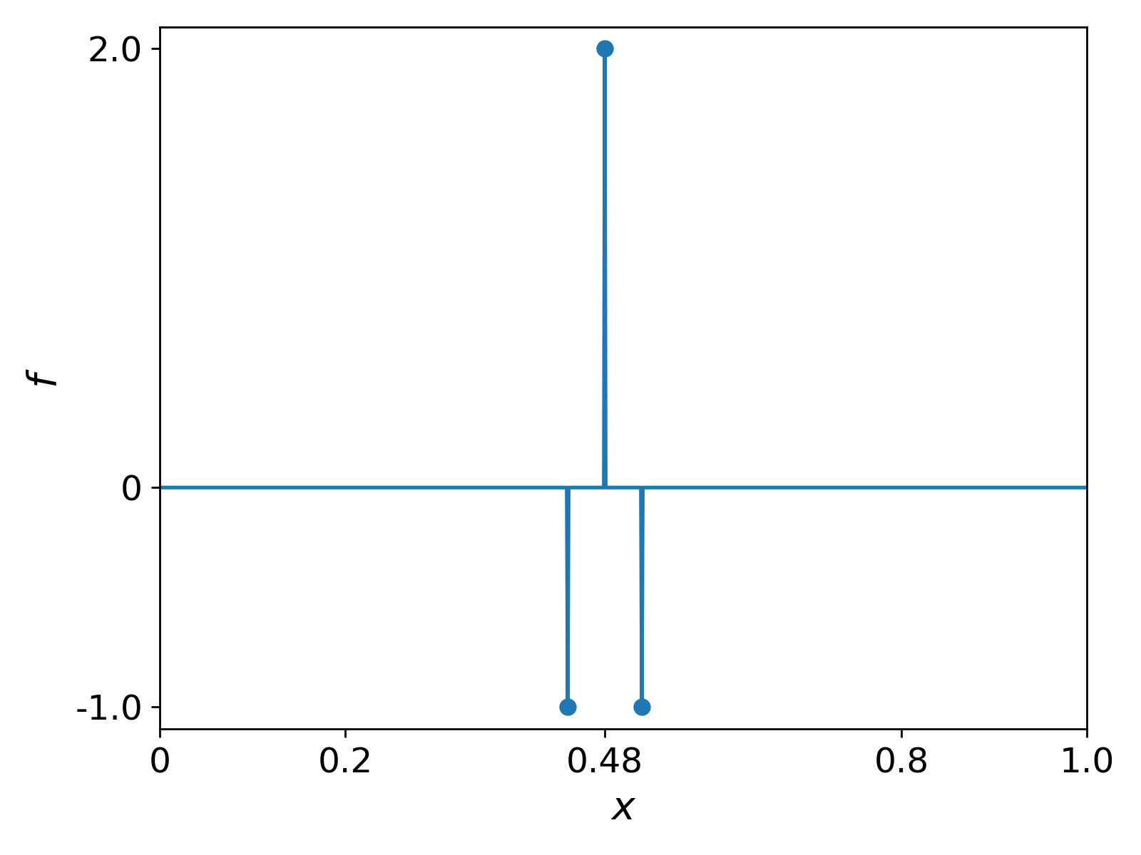 Note on the choice of quadrature. Note that when computing $\int_{0}^{1} f \phi_j $ in \ref{eq:discretized_system} we make use of the trapezoidal rule. In the example, the function $f$ is non-zero only on a set of measure $0$ and hence the Lebesgue integral $\int_{0}^{1} f \phi_j = 0$. Thus the trapezoidal rule is a poor approximation of this integral. However, we could have obtained the same results as above by using a piecewise-constant $f$ which takes the values $2$ and $-1$ on itervals rather than at points, and for which the trapezoidal rule would have been a better approximation, and we would have obtained the same results as above.