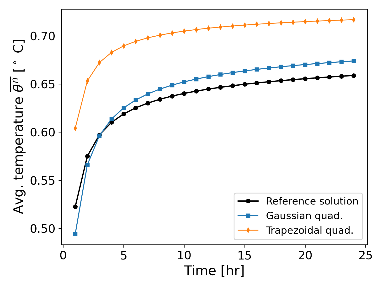 We now compute the solution using the Gaussian quadrature and trapezoidal quadrature on a uniform mesh with cell width $h = 0.025$ [m], and compute the average temperature given by \ref{eq:measured_value}. The results are shown in Fig. 3.